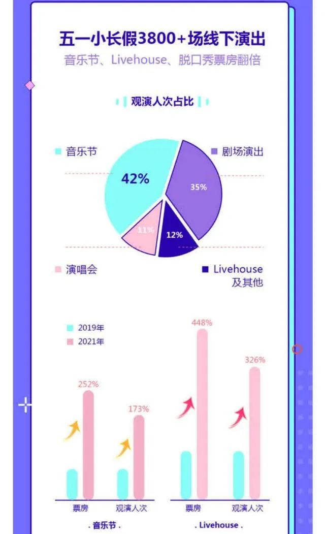 当下,音乐演出也可以算是不少年轻人的娱乐消费的刚需之一,大麦发布的《2021五一档演出观察》显示,2021年小长假中音乐节观演人次同比2019年增加了173%,Livehouse观演人次同比增长326%。