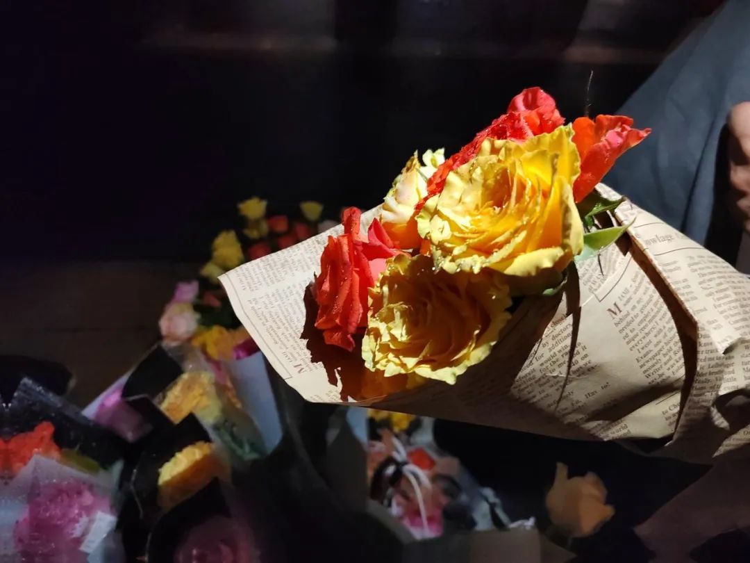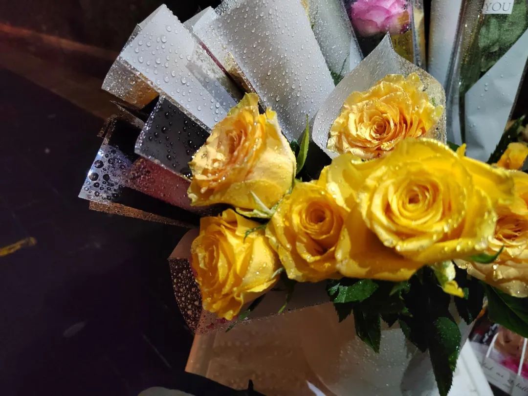 当晚,买花送给自己的女孩有好几个,她们大多喜欢香槟色和黄色,而男孩则偏爱红色。当一位女孩脱口说出“红色有点俗气”时,隔壁挑花的男孩正迅速锁定一枝正红色的玫瑰。——即使因为品种原因,正红色的玫瑰花头偏小,它依然是当晚最先售罄的颜色。