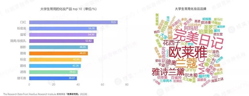 据校果科技相关信息显示,在单品选择上,口红成为了大学生常备化妆品的首选,在大学生常用化妆品top10中凸显个性的唇妆和眼妆产品占据了半壁江山。而在品牌的选择上,国产美妆品牌完美日记、花西子等呈现顶峰之势。