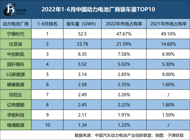 到了2022年上半年,宁德时代的动力电池市占率从上年同期的52.1%下滑至47.67%,比亚迪则从14.6%提升至23.78%,份额差距从34.5个百分点收缩至26.08个百分点。可以说,过去两年间,宁德时代在动力电池领域渐趋守势,而比亚迪则打了一场漂亮的反击战。