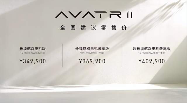 阿维塔11共3个配置,价格区间在34.99万元-40.99万元,两款长续航版本将于今年12月交付,超长续航版则于2023年一季度交付,限量版的阿维塔011售价高达60万元。