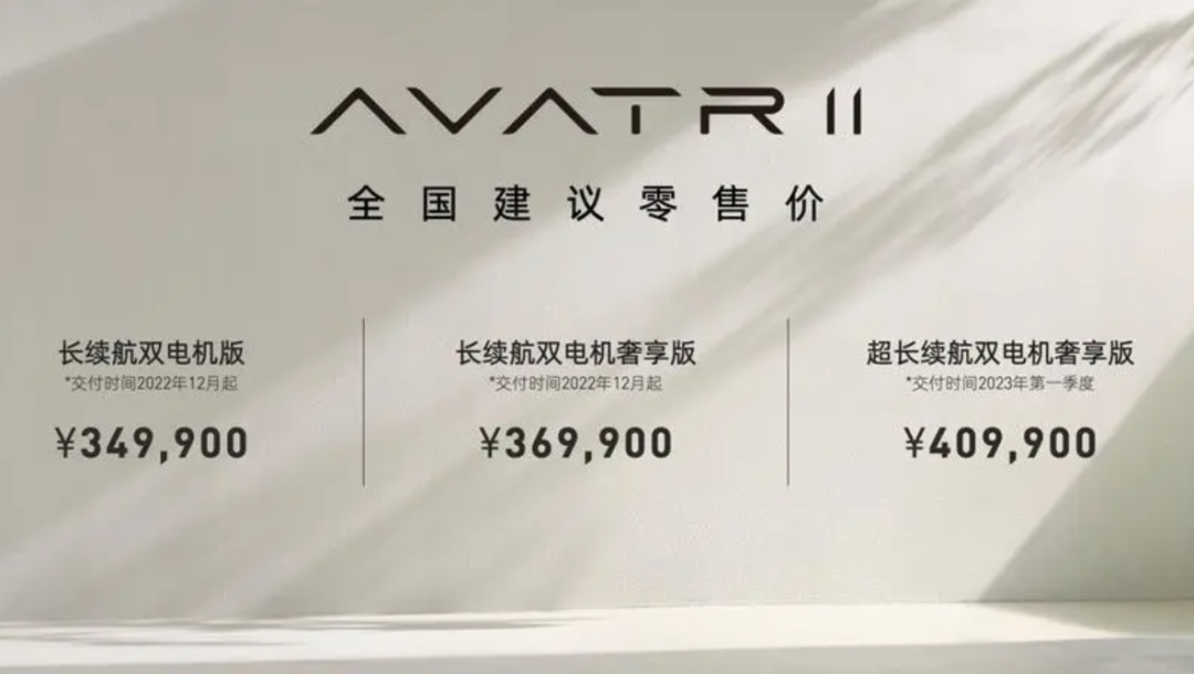 2021年11月15日,阿维塔在上海发布了首款车型——电动轿跑SUV阿维塔11。2022年8月8日,阿维塔11及其联名限量版车型阿维塔011正式上市,售价区间为34.99万元-60.00万元,预计将于2022年12月起开启交付。