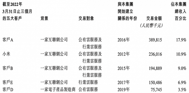 与此同时,前五大客户分别给金山云贡献的营收占比也分别达到了65.7%、61.5%以及50.5%。横向对比可以发现,金山云严重依仗这头部的五位客户。