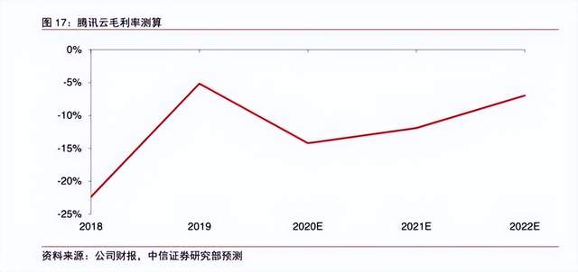 以腾讯云为例,中信证券曾进行测算,2020年-2022年,其毛利率分别为-14%、-7%以及-7%。2020年中,腾讯云与智慧产业事业群总裁汤道生就曾表示,腾讯未来五年计划投入5000亿,用于云计算、服务器等“基建”。