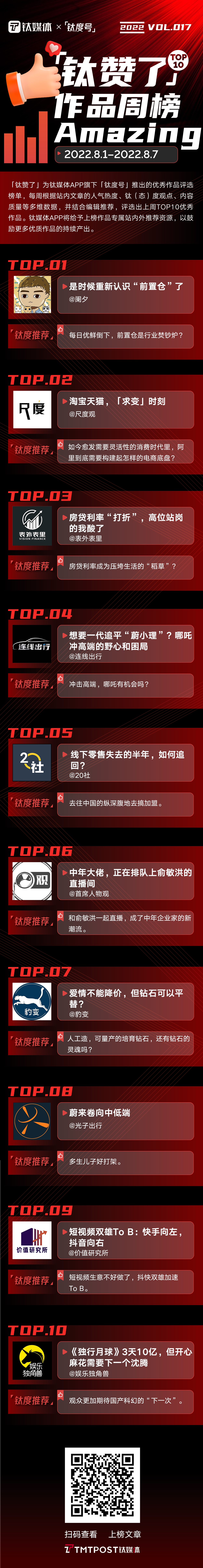 2022年8月1日—8月7日,「钛赞了」榜单第17期上榜作品为: