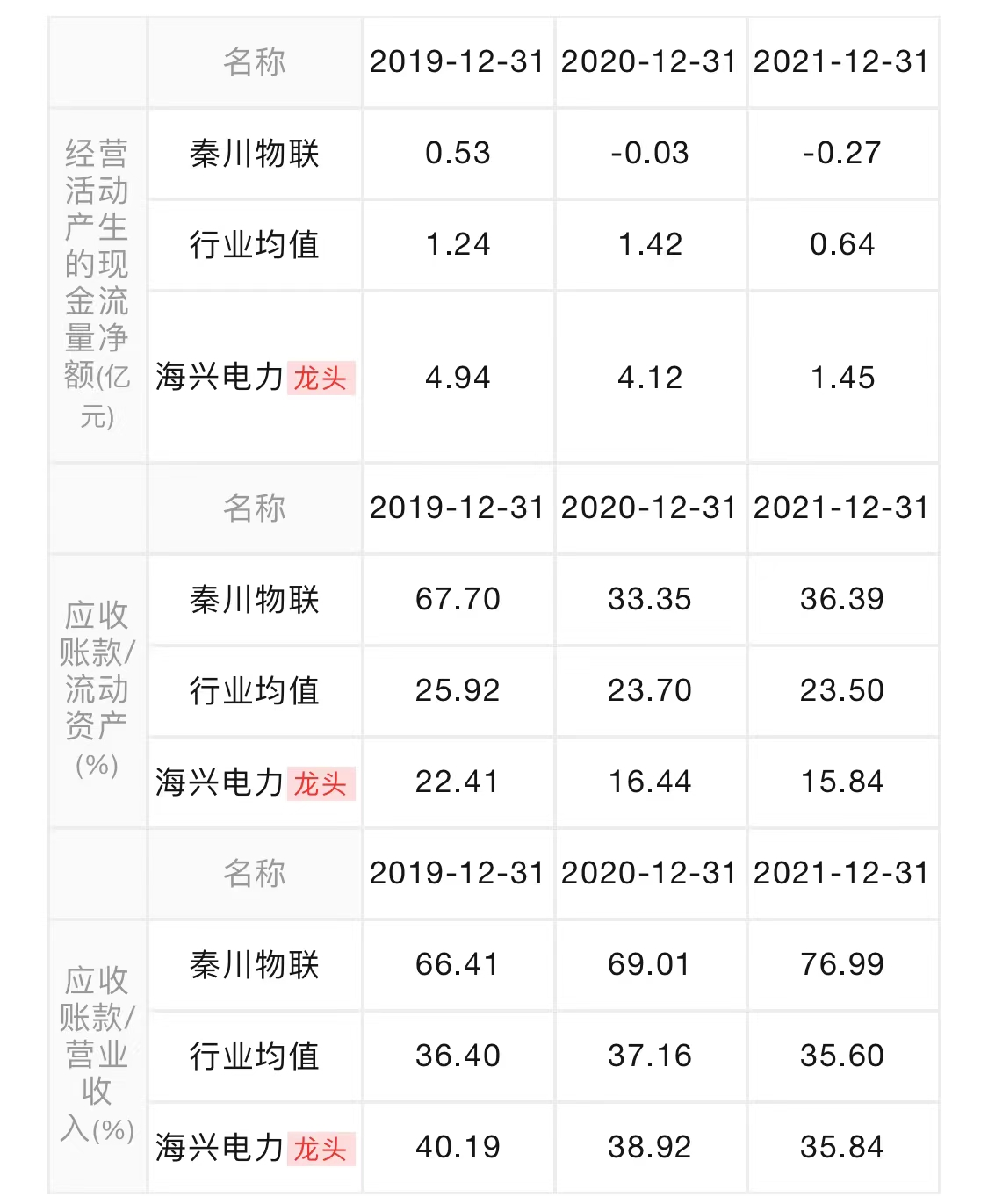 不仅业绩大幅下滑,秦川物联还存在应收账款占比较高、客户分散且规模较小的问题。2019年至2021年,公司应收账款占营收比例分别为66.41%、69.01%、76.99%,远高出行业三年平均值36.4%、37.16%、35.6%,2022 年 6 月末,公司应收账款余额为2.76亿元,占当期营业收入的比例为179.24%,若不能有效降低应收账款余额,或应收账款账期进一步延长,将面临营运资金不足、经营活动现金流量为负、信用减值损失增加等风险。