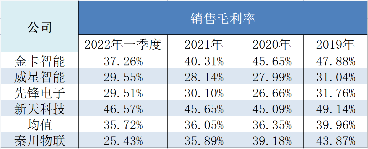 今年以来,秦川物联业绩表现不佳,营收与去年同期持平,归母净利润大幅下滑、出现亏损,2022年一季度、2022年半年报的营收分别为0.53亿、1.54亿,同比增长1.29%、0.44%;归母净利润分别为-0.08亿、-0.06亿,同比下降1017.38%、136.51%。公司表示,毛利率下降是公司净利润降幅较大的主要因素,2022 年上半年销售毛利率为 27.31%,较 2021 年上半年的 38.29%下降 10.98%;一季度毛利率25.43%,金卡智能(300349.SZ)、威星智能(002849.SZ)、先锋电子(002767.SZ)、新天科技(300259.SZ)等同行企业一季度销售毛利率分别为37.26%、29.55%、29.51%、46.57%,秦川物联远低于行业均值35.72%。数据显示,秦川物联2019年、2020年、2021年销售毛利率分别为43.87%、39.18%、35.89%,近三年的行业均值分别39.96%、36.35%、36.05%,相比之下,近三年秦川物联虽然毛利率持续走低,但是与行业均值基本持平,为何2022年毛利率会大幅下降?
