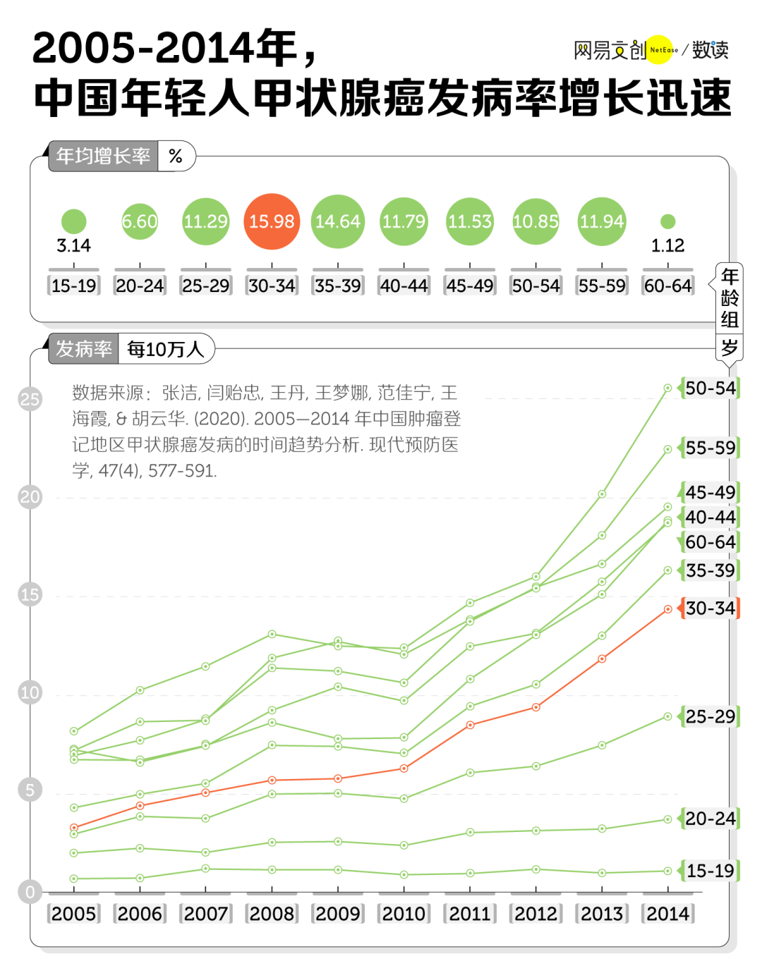 《美国临床医师癌症》杂志的一项研究统计,2020 年,在 15 - 29 岁年轻人中,甲状腺癌打败了其他癌症类型,“荣登”癌症新发病人数榜首 [10]。