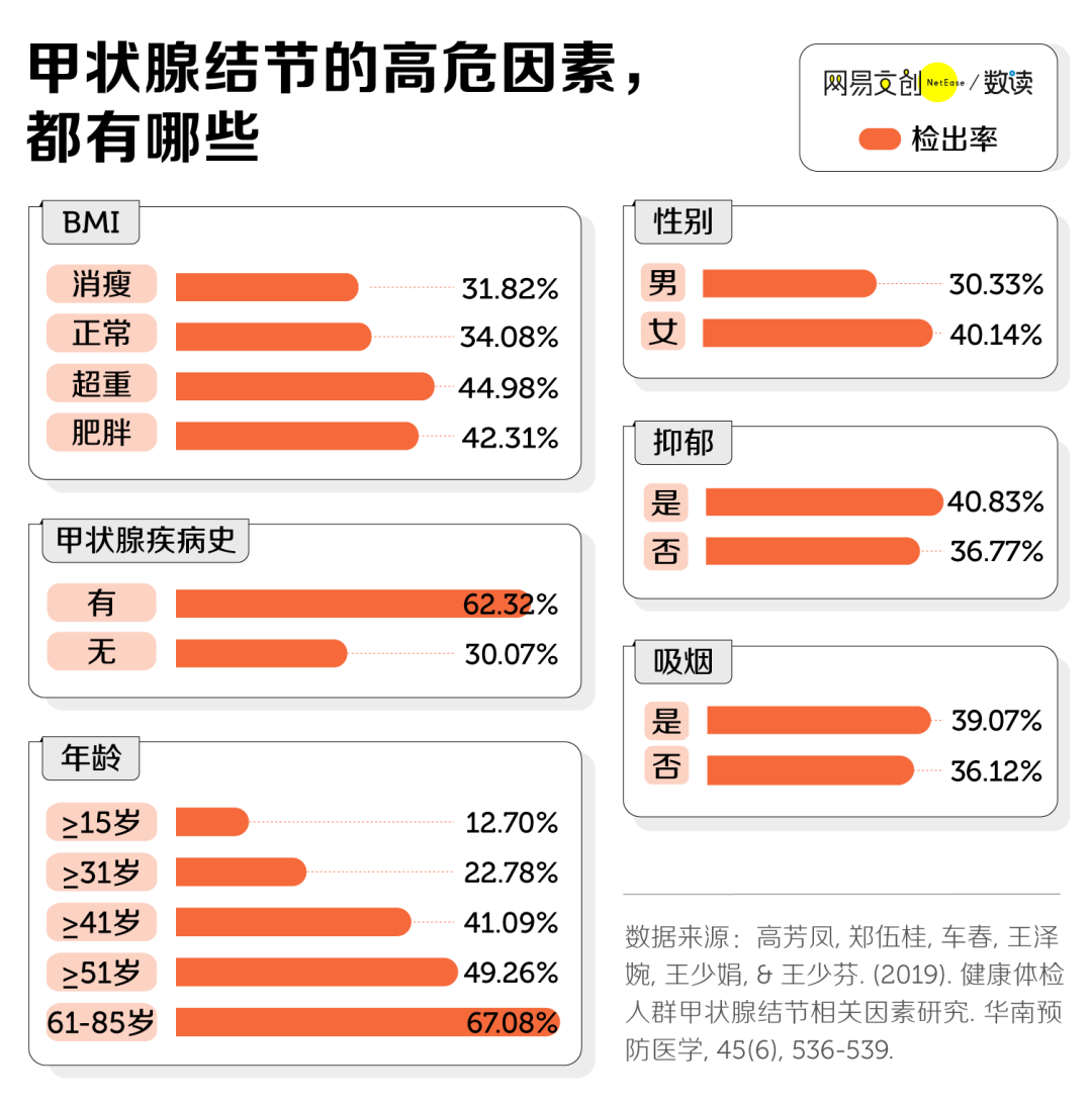 一项对海口医院的研究表明,从甲状腺疾病史、超重肥胖、是否吸烟到心情状况,都会影响甲状腺结节的发病情况 [16]。