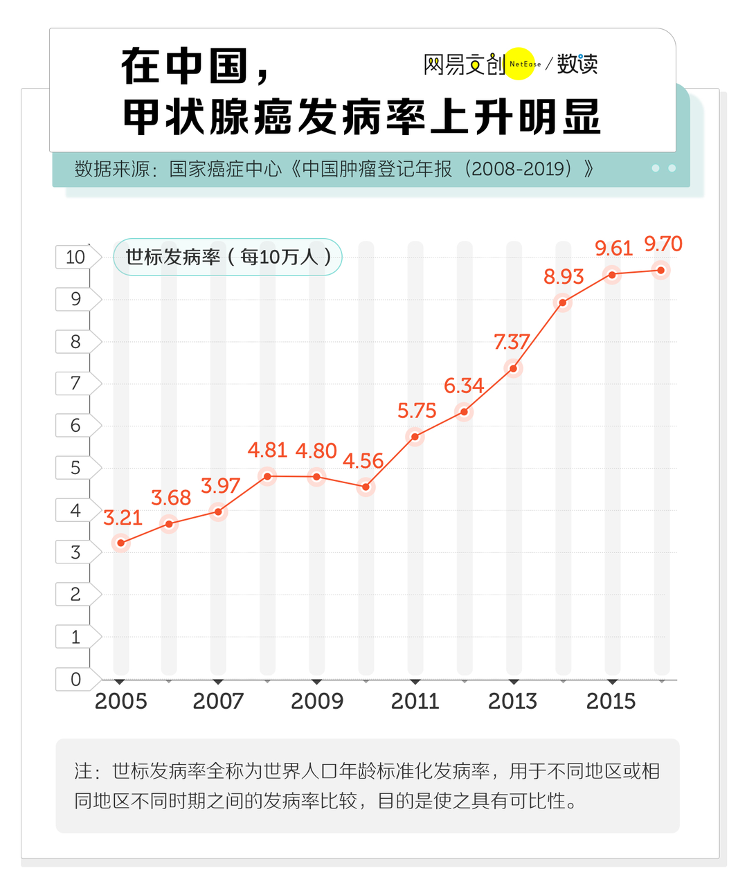 加之肿瘤登记点数量增多、登记质量提高 [8],越来越多的甲状腺癌被揪出来并登记在册,使得发病率迅猛上升。