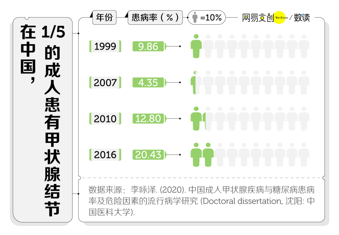 一项针对中国大陆地区的甲状腺功能抽样调查显示,2016 年中国甲状腺结节成人患病率约为 20.43%,每 5 个人里就有 1 个 [15]。