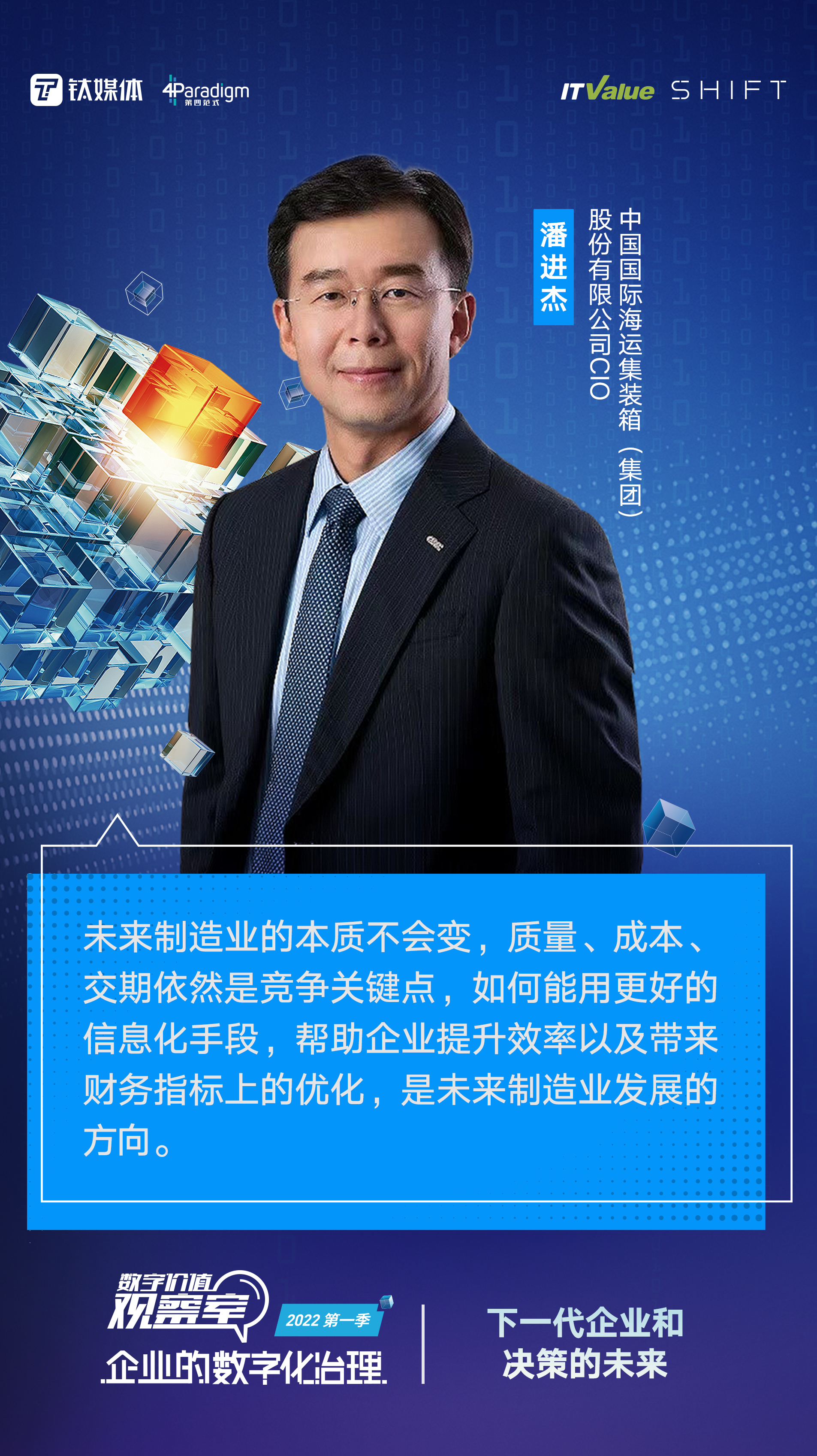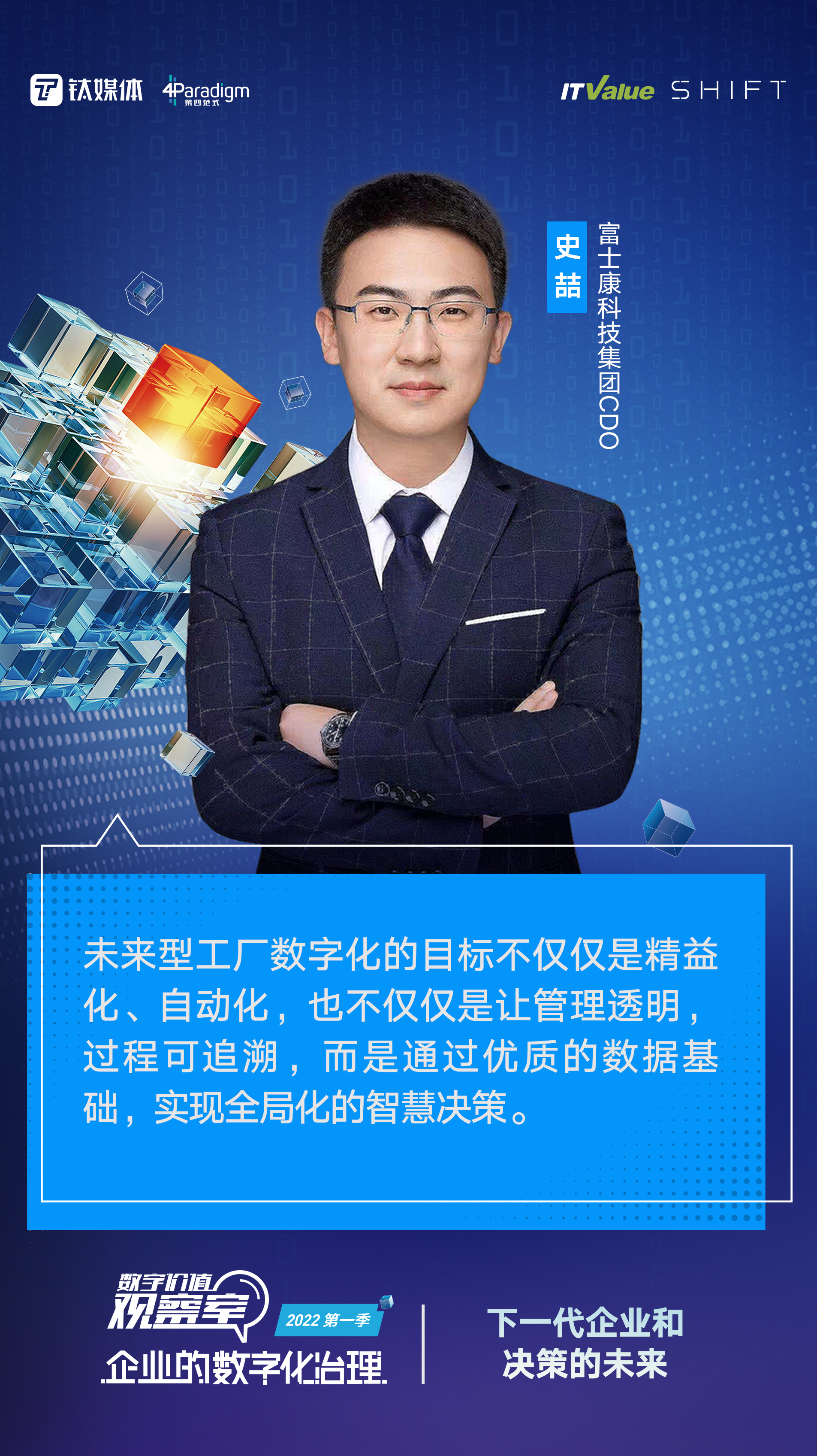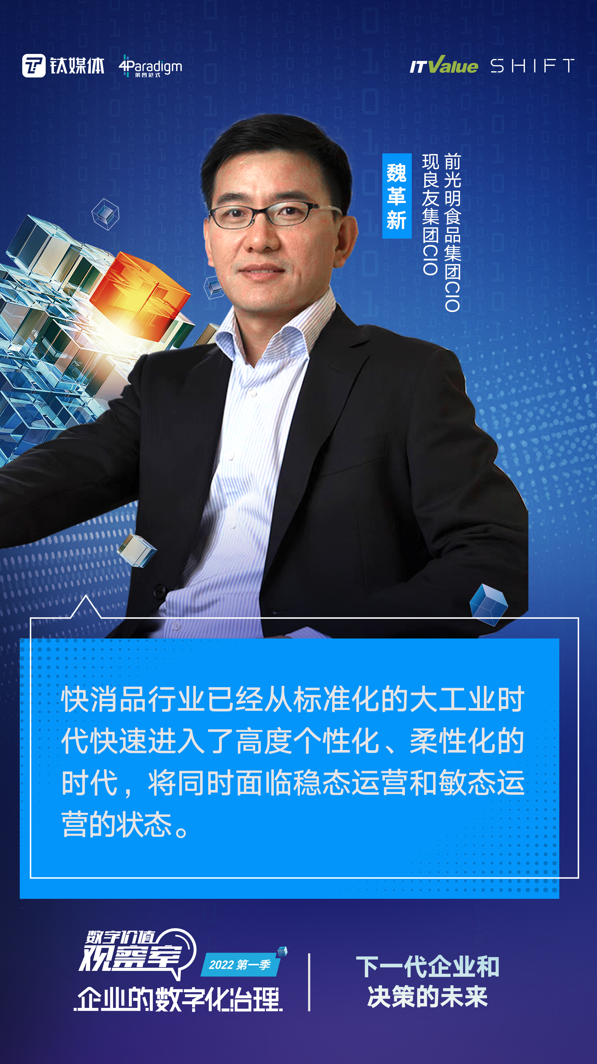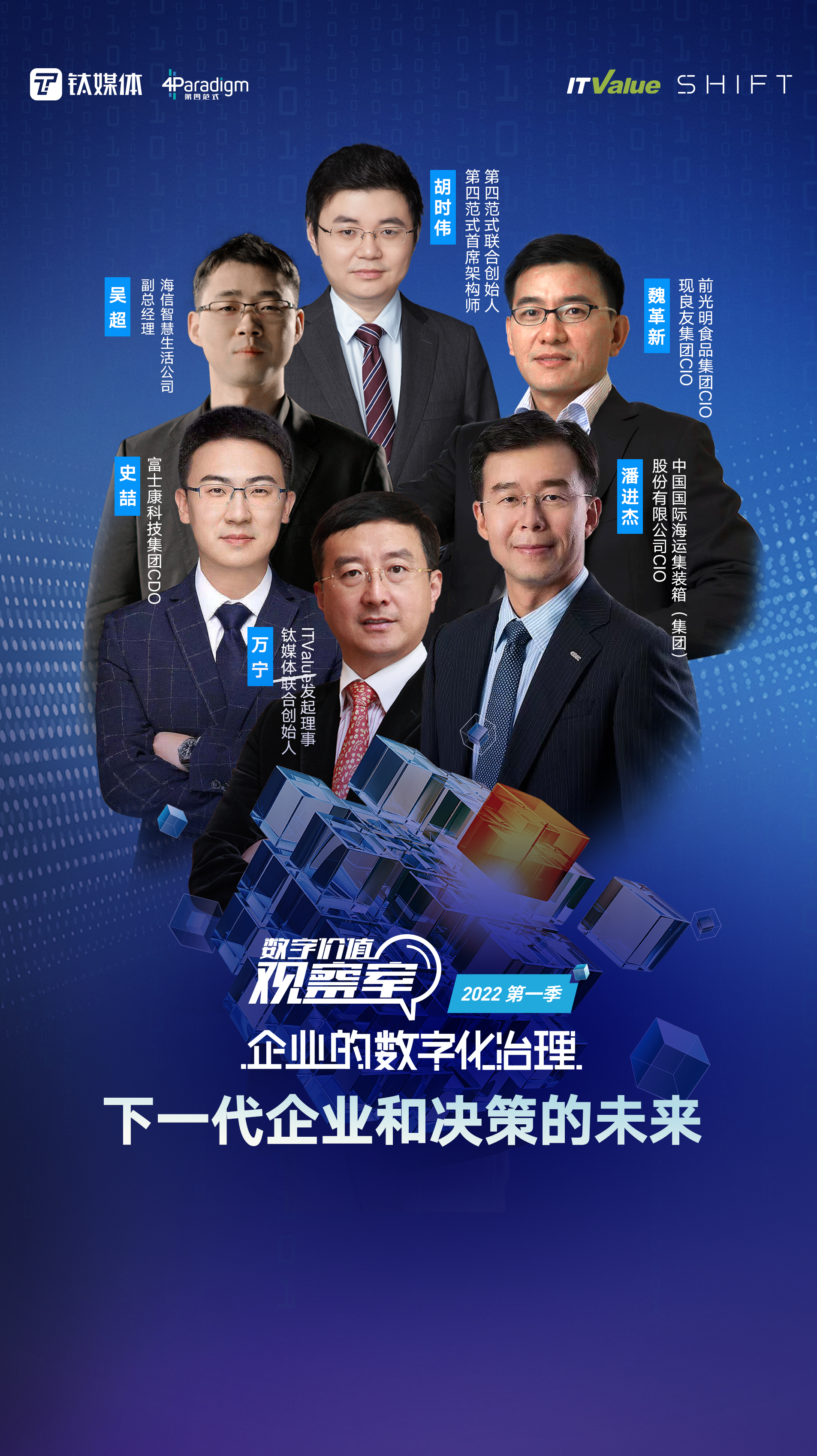 本期节目邀请到史喆——富士康科技集团CDO,潘进杰——中国国际海运集装箱(集团)股份有限公司CIO,吴超——海信智慧生活公司副总经理,魏革新——前光明食品集团CIO、现良友集团CIO,胡时伟——第四范式联合创始人、第四范式首席架构师,从管理者的视角出发,共同探讨企业数字化过程中的认知差异和实战案例,共同探寻企业数字化可供参考的有效的方法论。