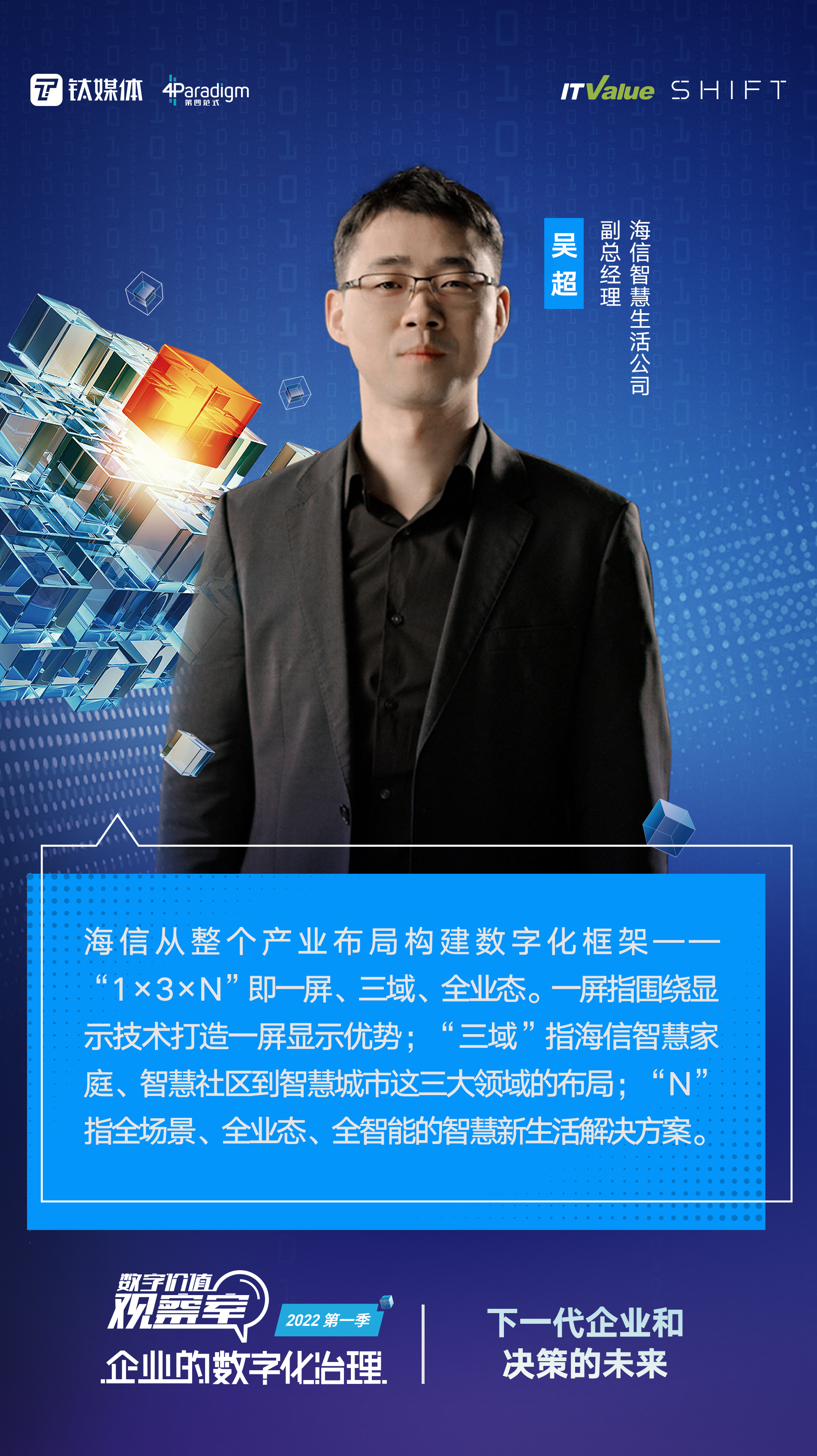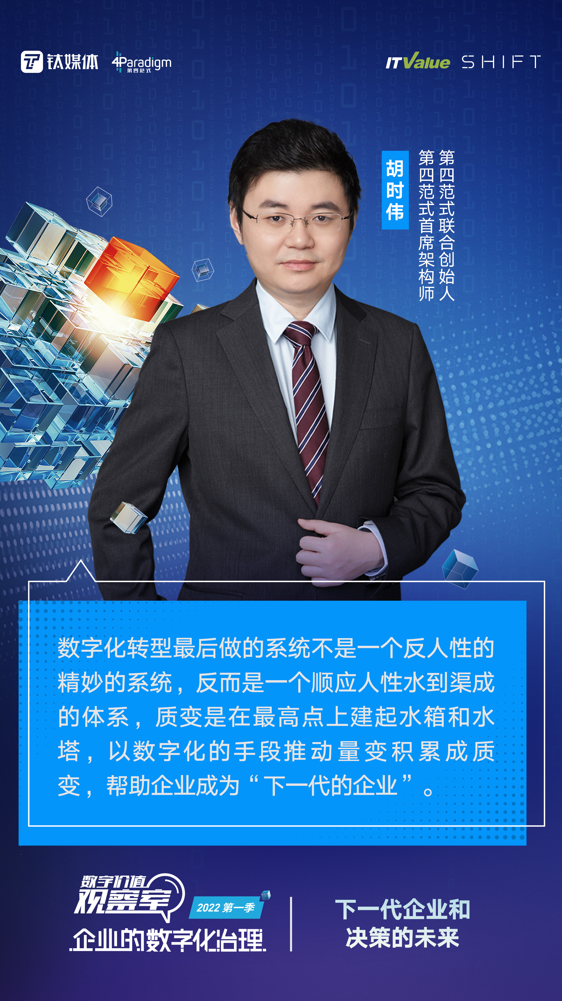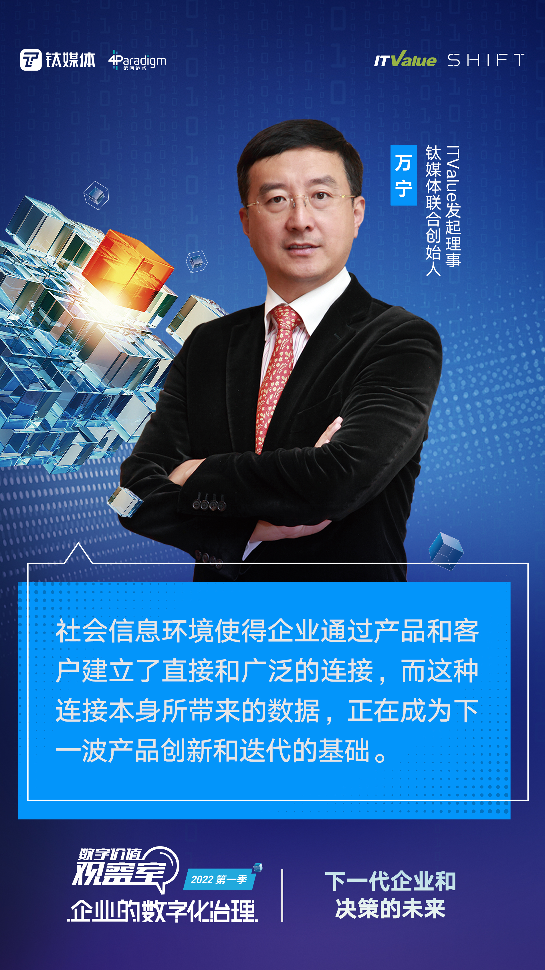 《数字价值观察室》是钛媒体与ITValue联合推出的一档有关企业数字化的深度视频访谈栏目。本期主题是【下一代企业和决策的未来】,今天我们会被日益完善的数字设备和网络环境所包围,每一家企业都进入到了不可逆的数字化的环境里,都需要去做出相应的转型来应对环境的变化,因此有了今天的这个话题。