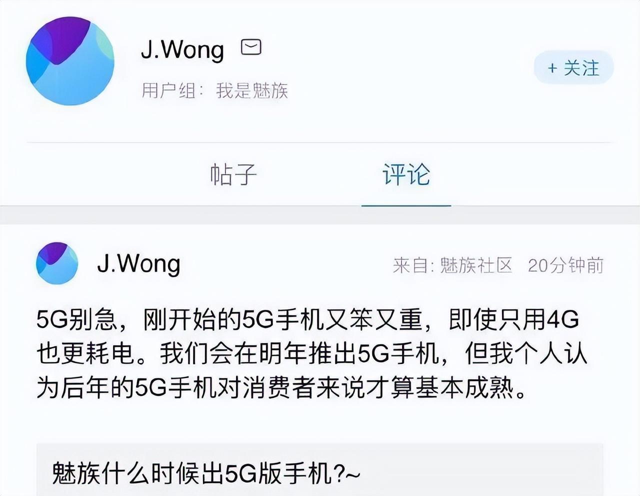 比如,2019年中,有魅友在魅族论坛询问“魅族什么时候出5G版手机?”随后,黄章回复道:“5G别急,刚开始的5G手机又笨又重,即使只用4G也更耗电。我们会在明年推出5G手机,但我个人认为后年的5G手机对消费者来说才算基本成熟。”