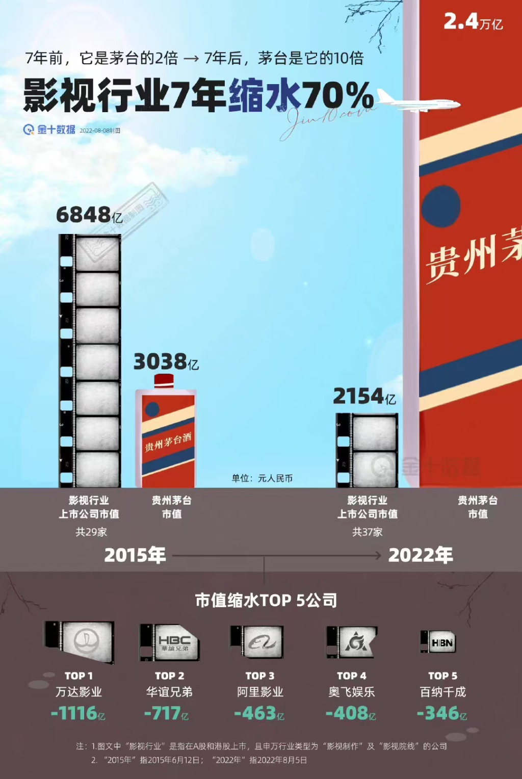 在2015年,影视行业29家上市公司市值总共6848亿元,是当时贵州茅台总市值的2倍。而到了2022年,37家上市公司总市值2154亿元,贵州茅台是整个行业的10倍。