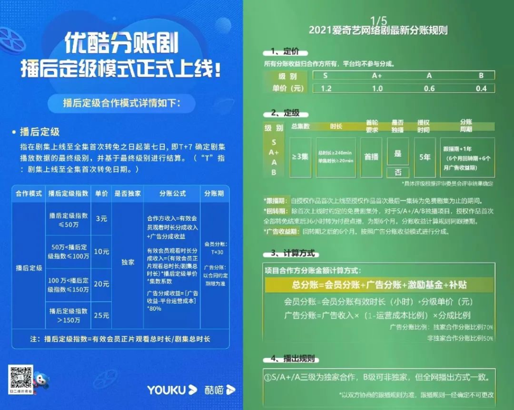 爱奇艺在2021年12月1日起推出了全新分账规则,平台将此前基于会员点击分账的会员分账收益判定转变为会员观看时长分账;优酷于今年1月17日正式上线了全新的“播后定级”模式;腾讯视频也在去年6月提出了以用户累计观看时长作为计费基础、提高分账比例、保底金额前置支付等三条新规。