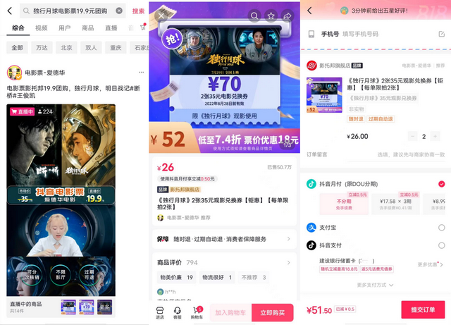 以电影票这一常见的团购品类举例,在抖音输入“独行月球电影票团购”后,可以看到多个商家在进行售卖,其中以视频和直播的形式居多,而有些商家更是宣传所售的票价低至19.9元/张。