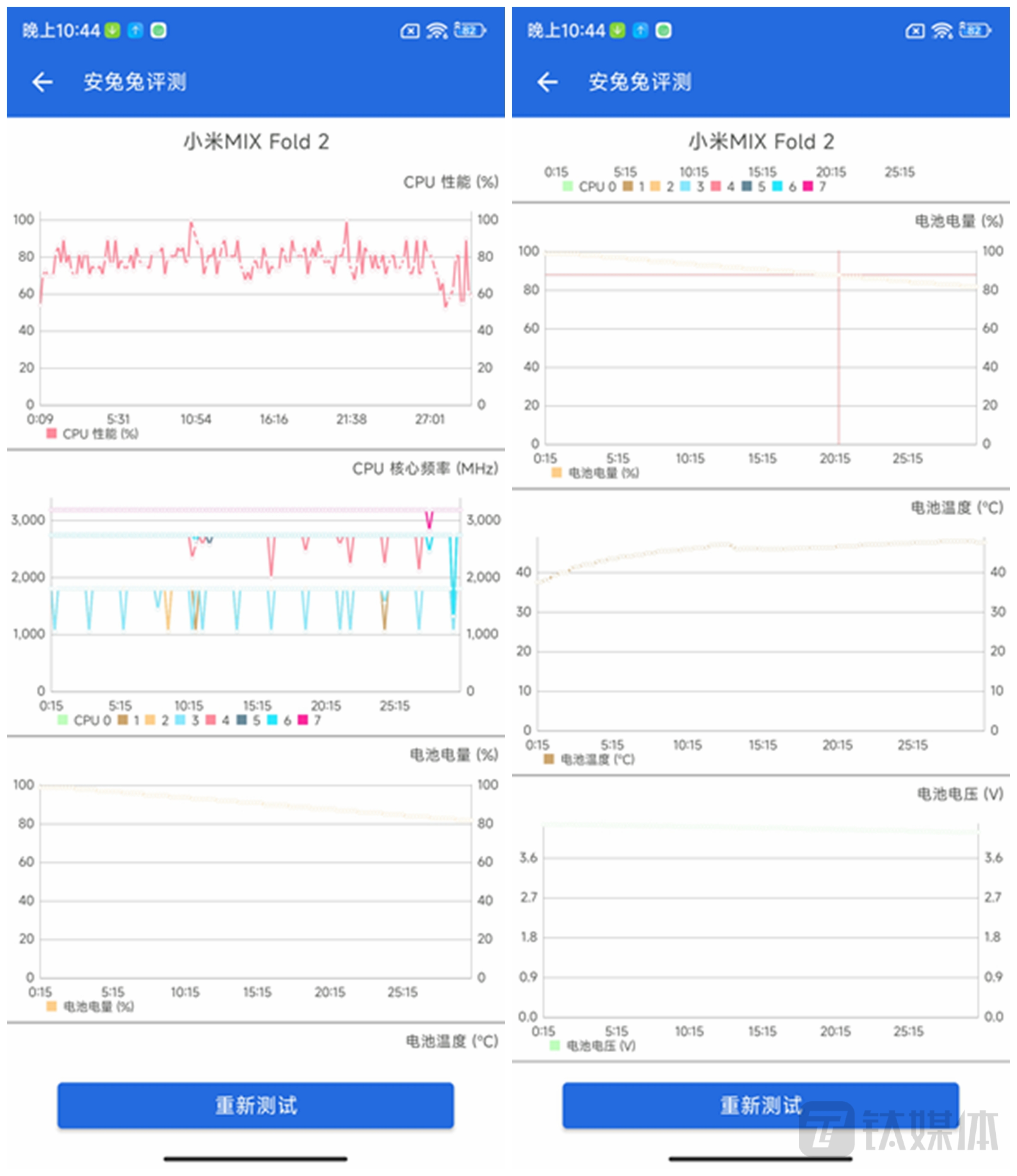 游戏体验的另一个重要环节就是散热能力,在开启性能模式下,用安兔兔压力测试持续运行30分钟后可以看到,小米MIX Fold 2大部分时间都能维持在高频运行。