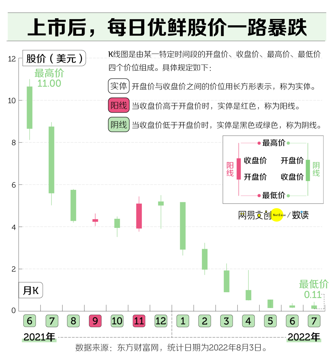 自那天起,每日优鲜的股价就开始“跌跌不休”,从上市时的每股 13 美元,跌至 2022 年 7 月的不到 0.1 美元,市值跌去了 99%。