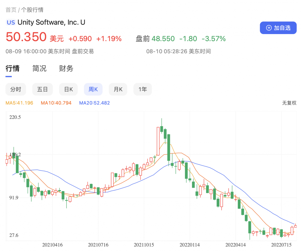 2021年9月,Unity在纽交所上市,发行2500万股,发行价为52美元,募集资金总额为13亿美元。如今过去11个月,Unity股价仅为50.35美元,不仅跌破了发行价,也仅有2021年11月最高点210美元的四分之一。