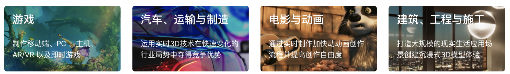 但显然,Unity的“野心”并不止于此。在其官网中,不仅游戏的解决方案被摆放在了明显的区域中,汽车、运输与制造;电影与动画;建筑、工程与施工等板块,也被设置到了同等重要的位置。可见,所有需要3D制作的场景,都是Unity想要染指的“掘金场”。
