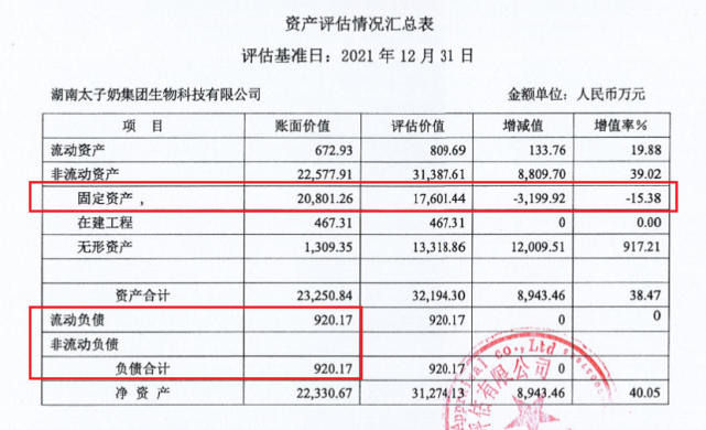 在上述评估报告中,湖南太子奶的资产主要以固定资产为主,占总资产的89.46%。同时,公司固定资产的账面价值,比评估价值高了15.38%,实际缩水了3199.92万元。在负债构成中,公司没有非流动负债,流动负债920.17万元为全部负债。