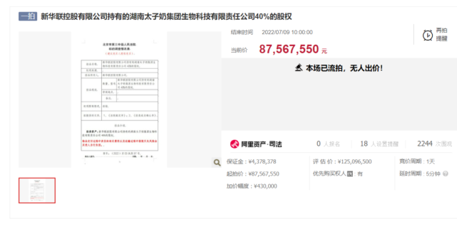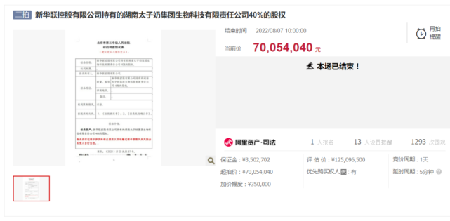 8月6日,上午10时,相关股份再次在淘宝网司法拍卖网络平台进行公开拍卖。同日,三元股份公告表示,公司于近日收到法院通知,将对湖南太子奶40%的股权进行第二次公开拍卖,起拍价7005.40万元。公司第八届董事会第七次会议审议通过了《关于参与新华联持有的湖南太子奶40%股权第二次拍卖的议案》,董事会同意公司参与本次拍卖并行使优先购买权。