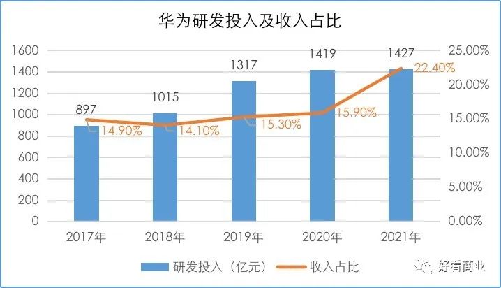 2021年,华为研发投入达到1427亿元,占全年收入的22.4%,创历史纪录。