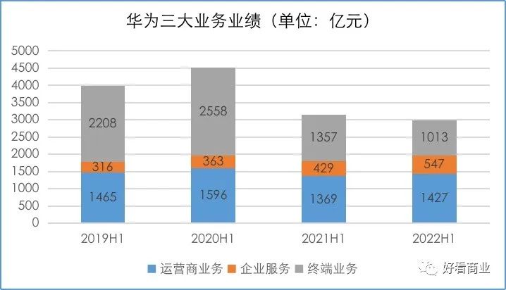华为营收主要来自三大块业务。今年上半年,其运营商业务实现收入1427亿元,企业业务收入为547亿元,终端业务(消费者业务)收入1013亿元。