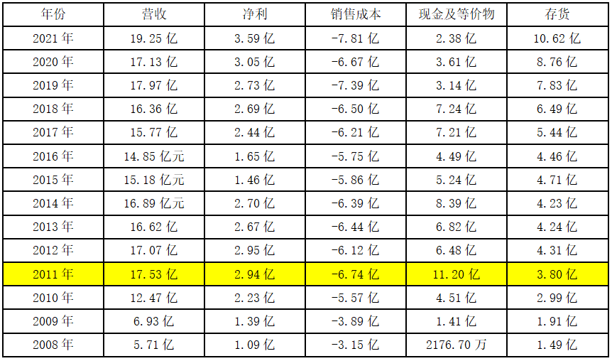 公司业绩止步不前的同时,现金及等价物逐年递减,从上市时的11.2亿下降到2021年的2.38亿。另一方面,公司的存货却不断高企,从2008年的1.49亿增长至2011年的3.8亿,到2021年已经飞升至10.62亿。