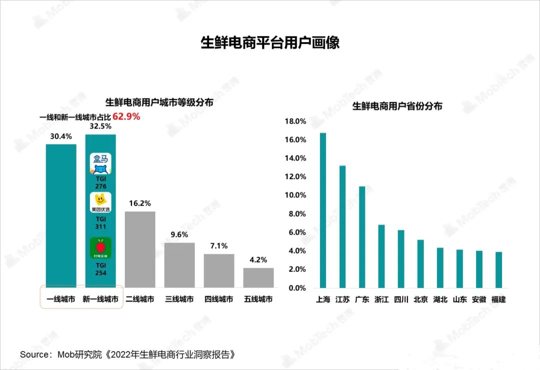 这么看来,叮咚买菜关闭多个城市站点,并非是坏事。Mob研究院的《2022年生鲜电商行业洞察报告》中有数据显示,生鲜电商用户主要集中在一线与新一线城市,占比达到了62.9%。
