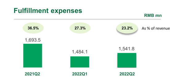 叮咚买菜2022年第二季度财报显示,已经逐渐降低了前置仓的履约费用率。第二季度履约费用为15.418亿元,履约费用率为23.2%,同比下降了9.2%。与之相对的则是叮咚买菜第二季度的毛利率达到了31.6%,毛利率覆盖了履约费用率,才实现了阶段性的盈利。