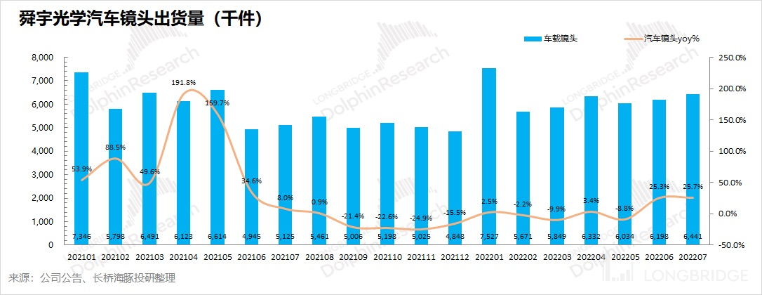 在汽车镜头市场,舜宇一直占据全球 30% 以上份额的垄断地位。舜宇光学 2022 年 1-7 月汽车镜头出货量 4405 万件,同比增长 3.8%。