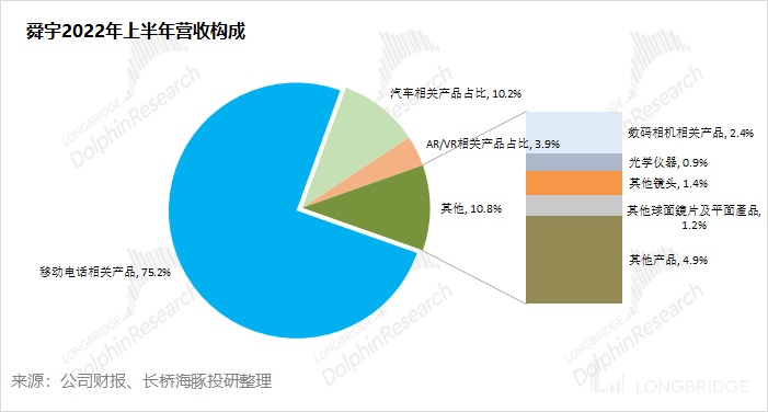 从舜宇光学 2022 年上半年的营收来看,手机业务仍是公司最大的收入来源,但占比从过去的 8 成以上,下降到现在的 75%。随着汽车业务和 AR/VR 业务的成长,公司从这两年开始对该两项收入进行单独披露。