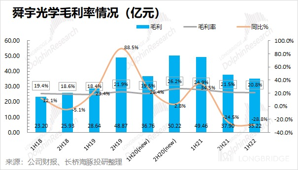 舜宇光学在 2022 年上半年实现毛利 35.22 亿元,同比下滑 28.8%。公司本季度毛利的下滑幅度大于营收的跌幅,主要原因在于公司上半年的毛利率也出现了较大滑落。