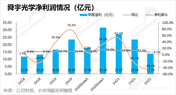 舜宇光学科技在 2022 年上半年实现营收 169.72 亿元,同比下滑 14.4%,低于市场预期(176.19 亿元)。舜宇上半年的不及预期,主要是受手机市场需求疲软及摄像头有降规降配的趋势,直接拖累公司整体收入表现。