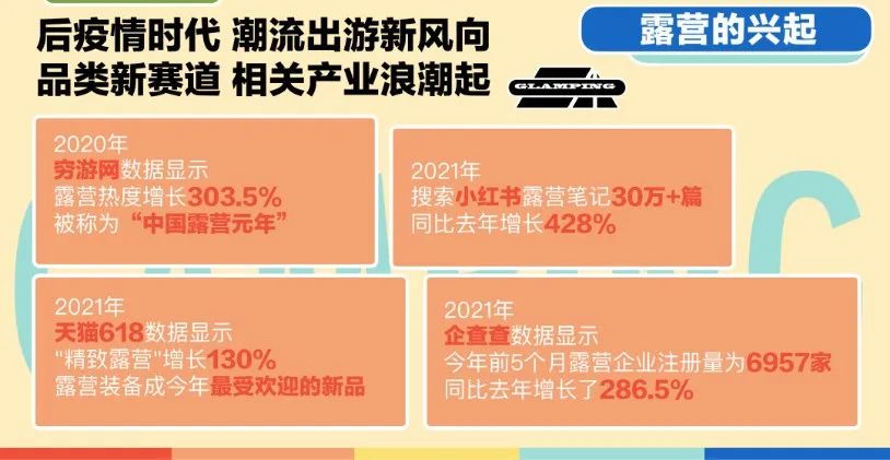 后疫情时代,露营成为了青年们最潮的旅行方式。据穷游网数据显示,2020年露营热度增长303.5%,被称为“精致露营元年”。