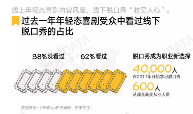 同样在2017年,《吐槽大会》以黑马姿态杀出重围。根据CBNDate显示,仅在2017年就有4万人开始学习脱口秀。