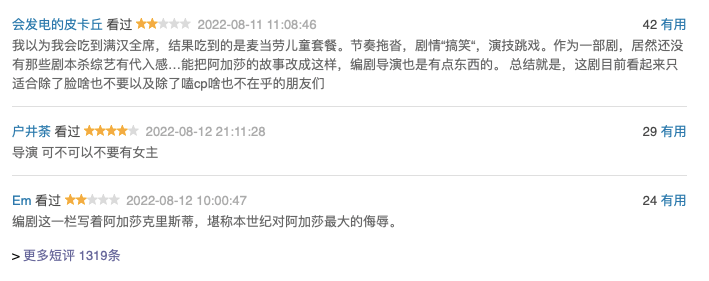 根据“推理小说女王”阿加莎·克里斯蒂小说改编的《民国大侦探》,同样遭到原作粉丝的无情吐槽。本格推理爱好者评价该剧平铺直叙,节奏拖沓,缺乏悬念感,甚至有评论恨铁不成钢,称“编剧这一栏写着阿加莎·克里斯蒂,堪称本世纪对阿加莎最大的侮辱。”