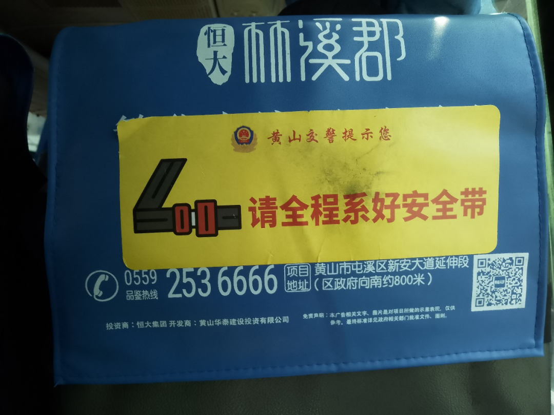 开往黟县的小巴车有些老旧,原本每张座椅背后都贴着恒大的楼盘广告,可能是因为恒大最近深陷烂尾楼风波,小巴座椅背后的恒大广告被一张“请全程系好安全带”的标语遮盖了关键信息。黄色标语和蓝色广告,在并不宽敞的空间里形成几十组鲜明的对比色,占据每一个乘客的视野。
