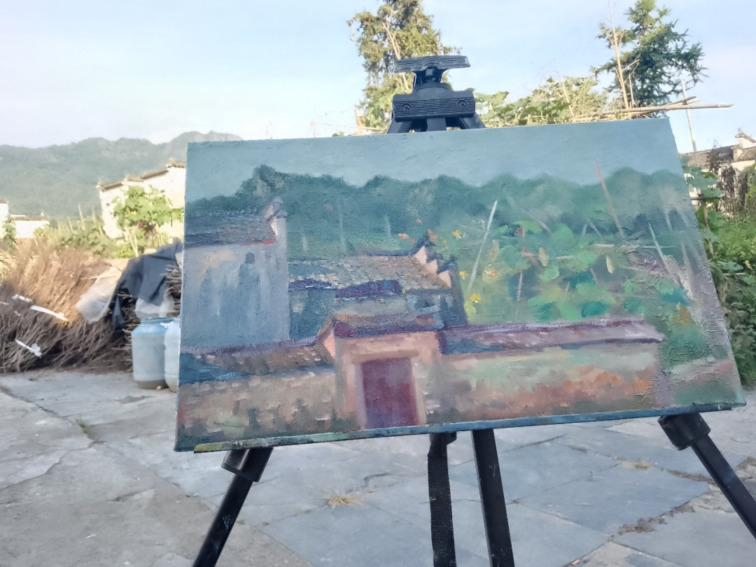 村民的家经常成为画中物,村民也经常成为画中人,没有人觉得时刻被观察的生活有什么异样。太阳快要下山,村里的白发老人走到柴火垛边,把晒在那里的两盘辣椒搬回家,不到十米外,一个“画画的”正在加紧完成最后几笔。