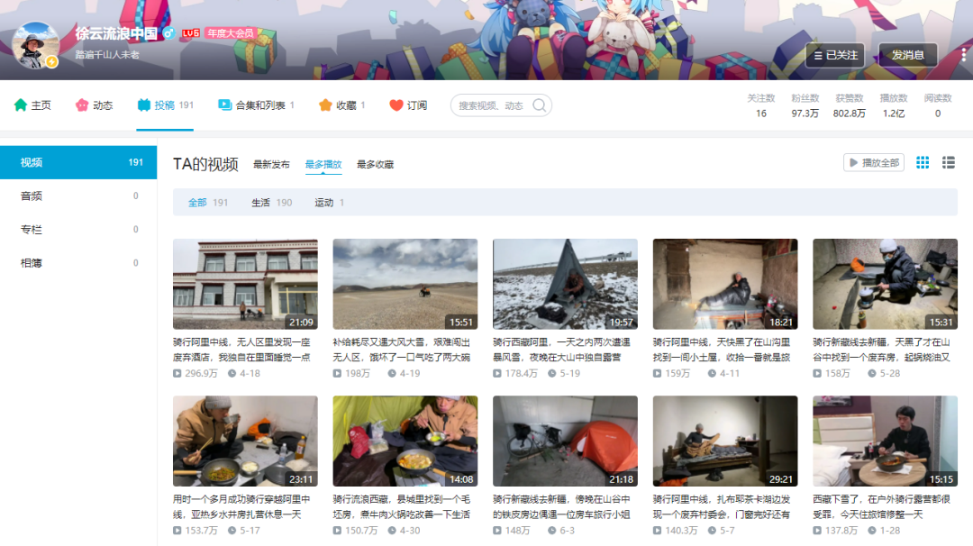 四个月时间涨粉80万+,目前粉丝总数即将突破百万。近期B站有一位up主疯狂吸粉,这一成绩让他成了旅行区涨粉最快、全站涨粉最快的up主之一。