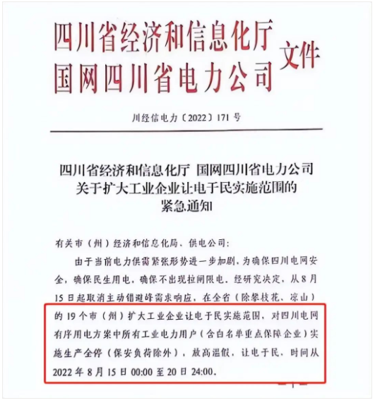 重压之下,8月14日,四川省经信厅和国网四川省电力公司发布《关于扩大工业企业让电于民实施范围的紧急通知》(下称《通知》)。