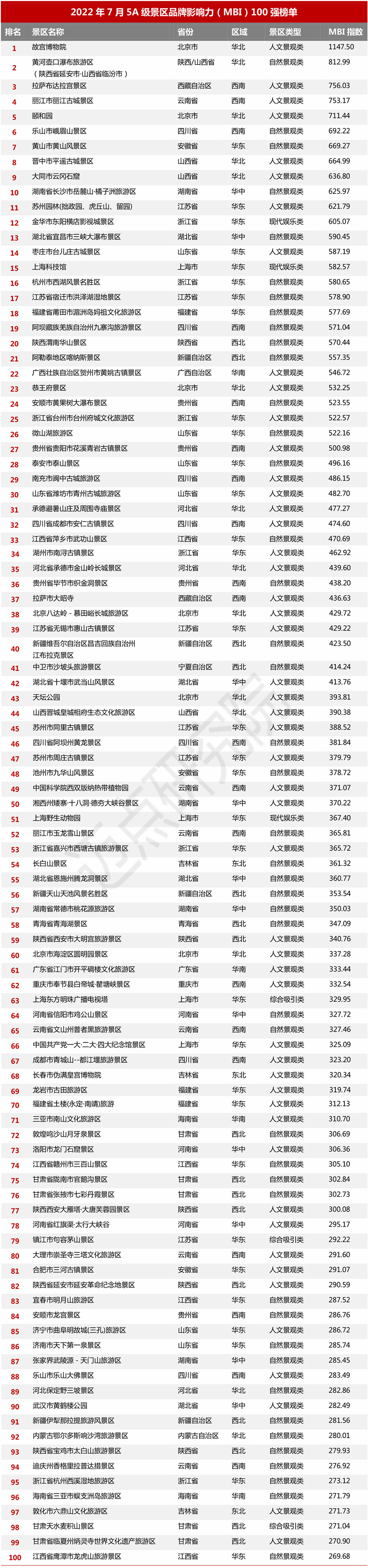 月度景区品牌百强榜单由迈点研究院研制,旨在通过数据解读景区在互联网及移动互联网领域的影响力,为景区制定战略方案提升品牌发展赋能。以下是迈点研究院独家发布“2022年7月5A级景区品牌影响力(MBI)100强榜单”。 7月,故宫博物院、黄河壶口瀑布旅游区(陕西省延安市•山西省临汾市)、拉萨布达拉宫景区位列前三甲,另有丽江市丽江古城景区、颐和园、乐山市峨眉山景区、黄山市黄山风景区、晋中市平遥古城景区、大同市云冈石窟和湖南省长沙市岳麓山•橘子洲旅游区进入榜单前十。