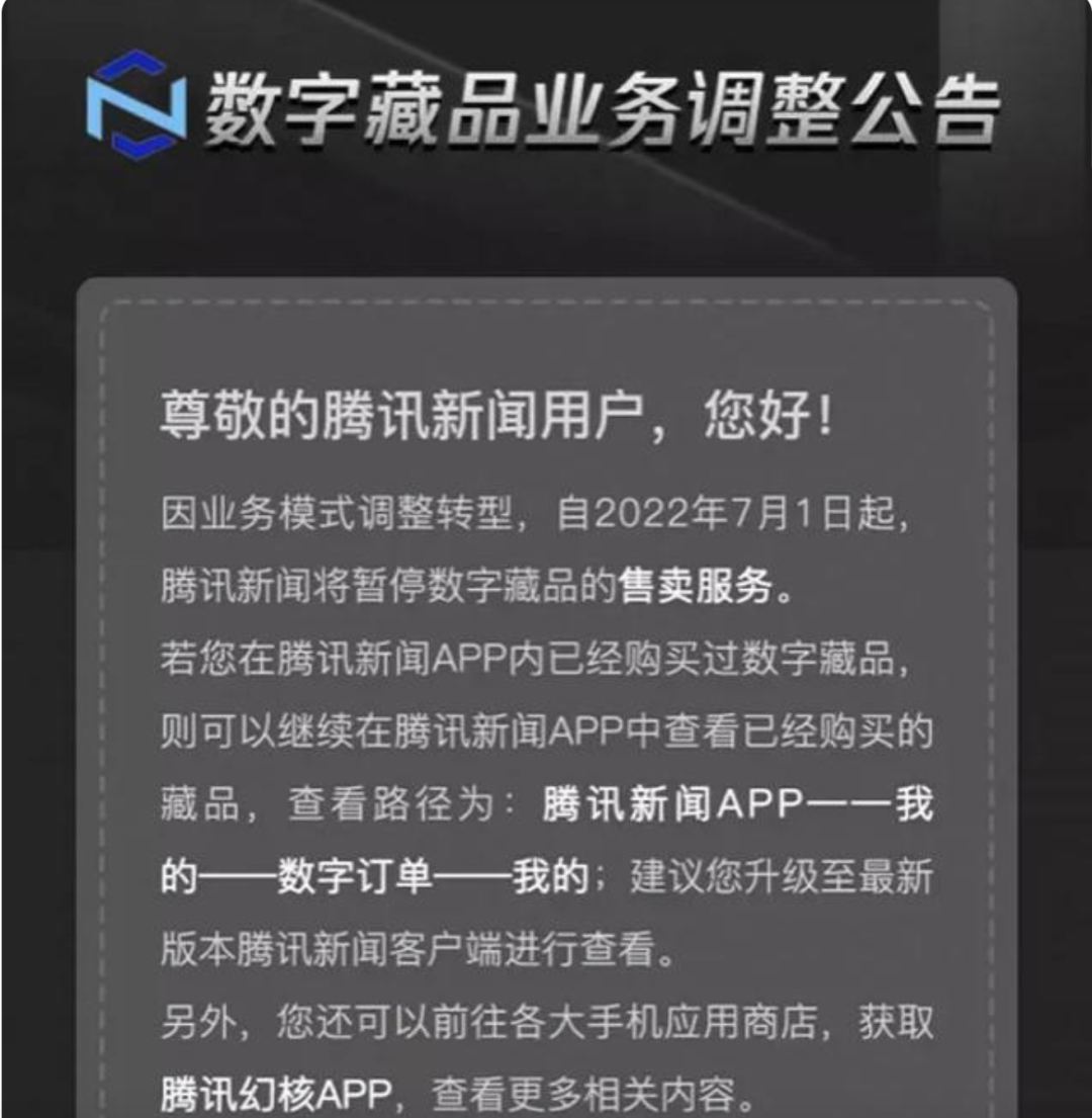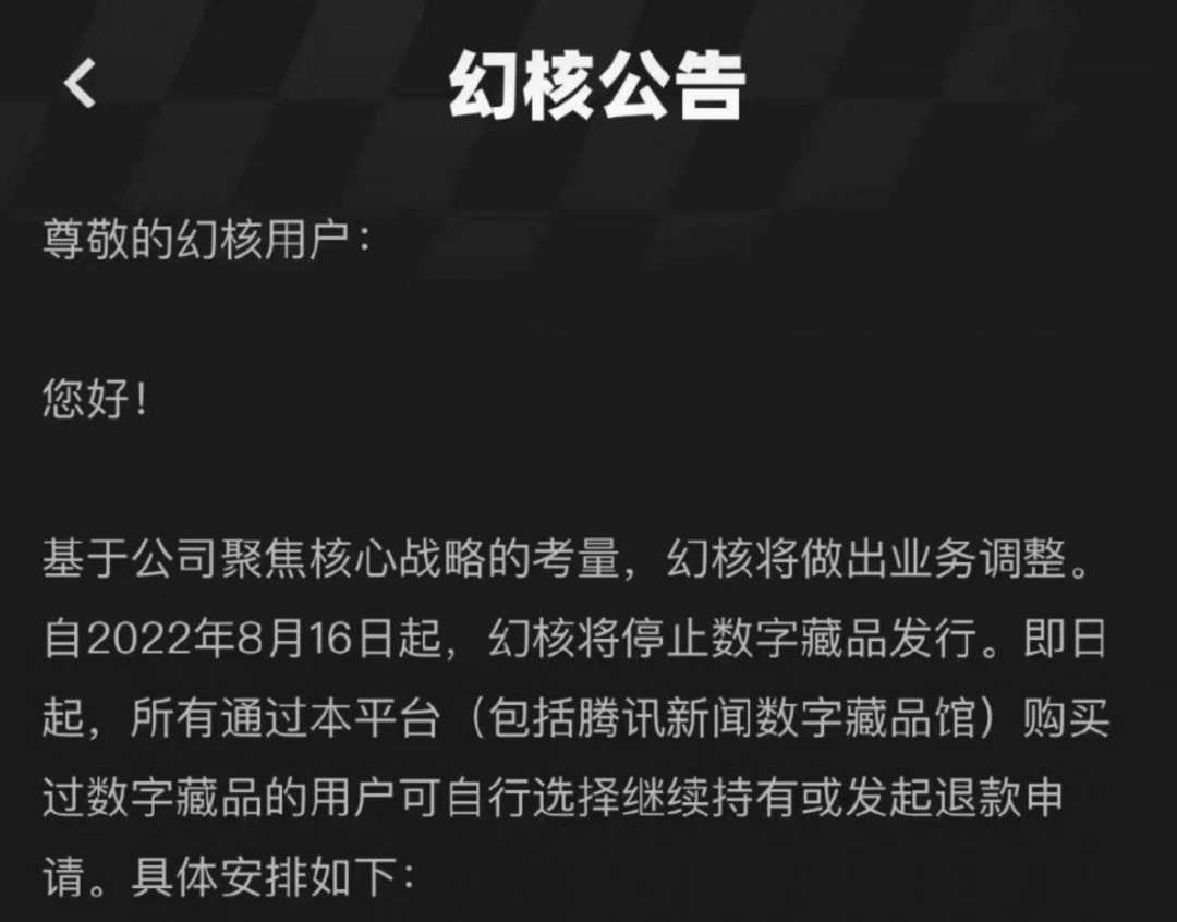 公告中显示,基于公司聚焦核心战略的考量做出业务调整。自2022年8月16日起,幻核将停止数字藏品发行,所有通过其平台(包括腾讯新闻数字藏品馆)购买过数字藏品的用户可自行选择继续持有或发起退款申请。
