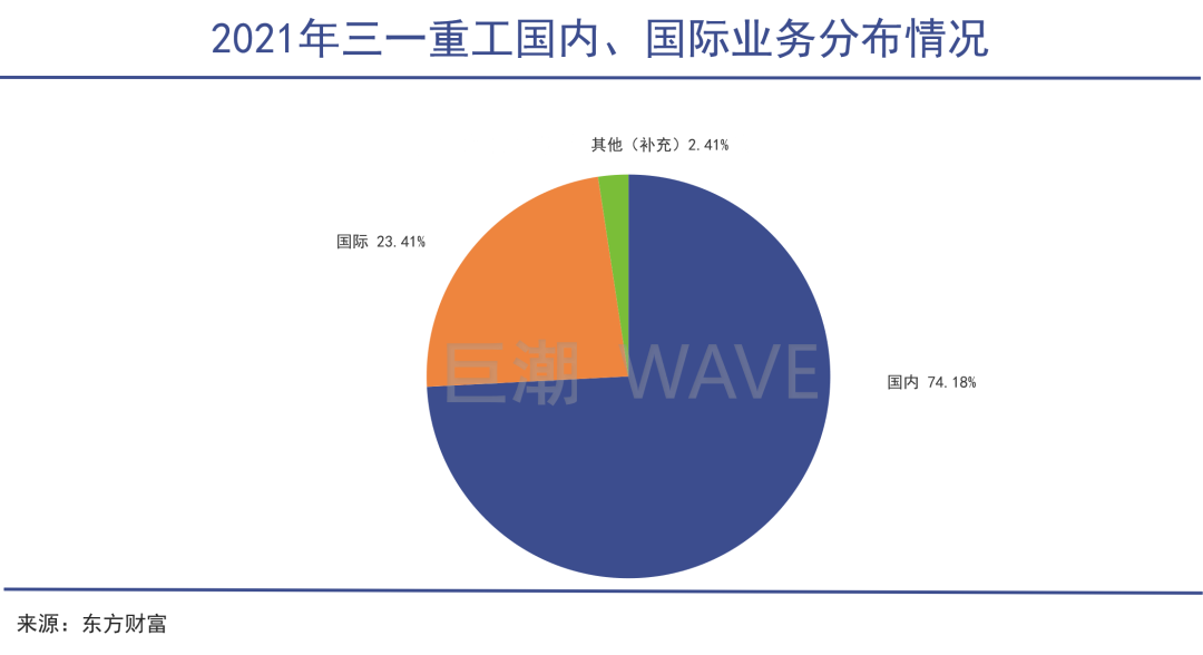 2021年,三一重工声称国际化取得积极进展,实现国际销售收入248.46亿元,同比增长76.16%,国际收入占营业收入比重同比上升9.2个百分点,但也仅占营收总额的23.41%。