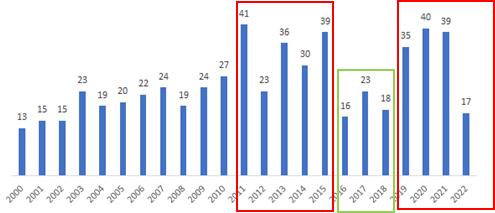 PubMed 历年搜索 FAK 综述论文数量(截至2022年5月)