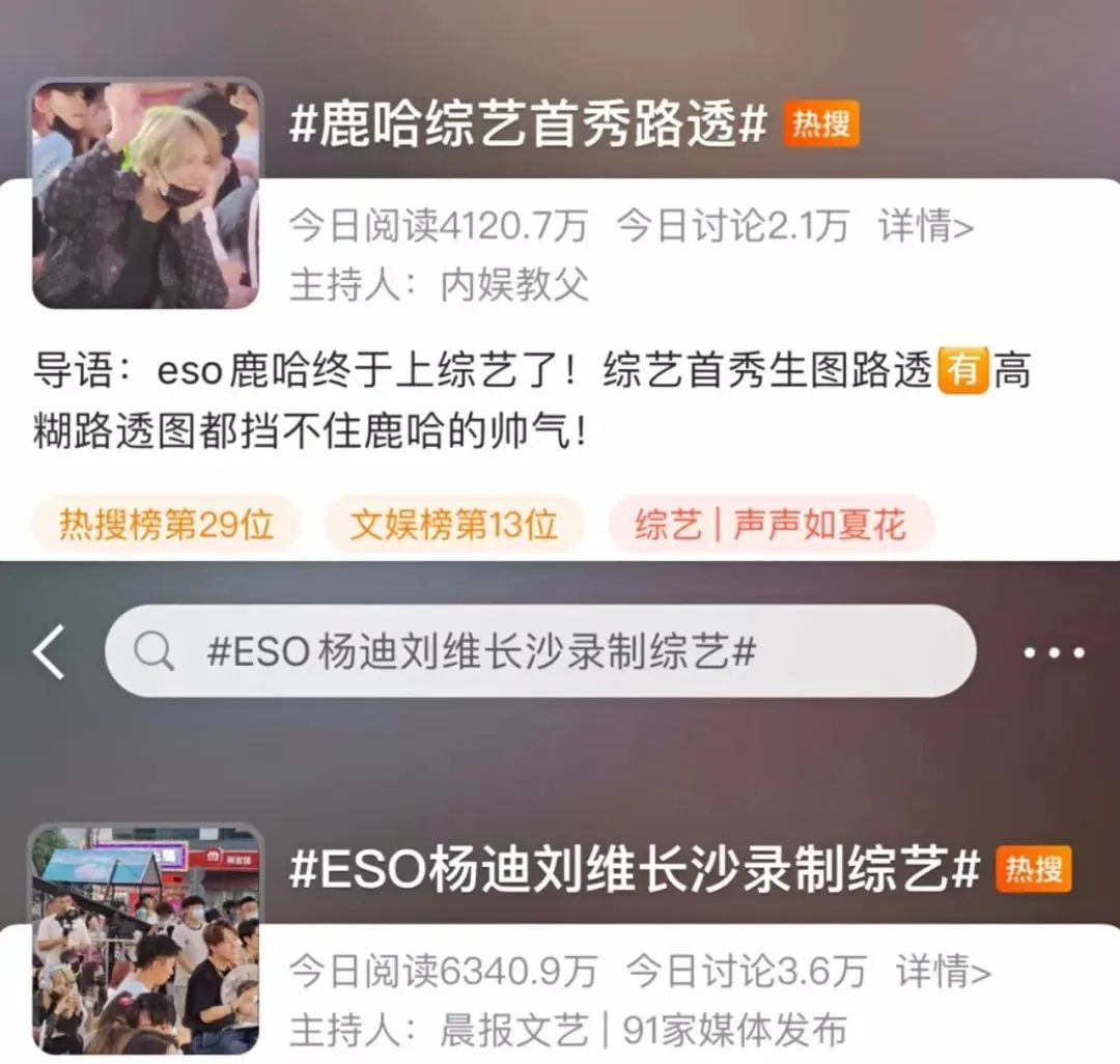 变味升级的导火索是,8月11日,有营销号发文称ESO在长沙录制综艺节目,随后#ESO杨迪刘维长沙录制综艺# #鹿哈综艺首秀路透#两个词条登上微博热搜高位。引发网友热议的同时,也瞬间点燃了追星女孩的“怒火”。