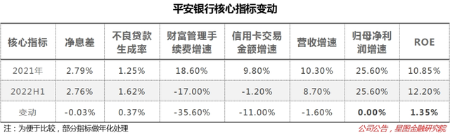 具体来看,2022年上半年,平安银行净息差收窄3个BP,不良贷款生成率(还原不良核销后的不良贷款生成额/期初贷款余额)抬升0.37个百分点,财富管理手续费从大幅增长变为同比负增17%,信用卡交易金额出现负增长,营收增速下降1.6个百分点。