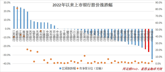 就这些压制因素来看,不同银行所受影响不同,因而股价表现也是冰火两重天: